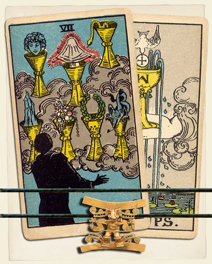 Seven of cups and Ace of cups combination is an omen that two arcane effects: 1) Daydreaming and 2) Emotional Awakening are steering you into another direction today. To put it differently, it means you are coming to realize that the dreams floating through your mind are not just random fairytales, but hold truth in your destiny. Few people have the power to interpret the meaning behind their thoughts. By digging through the surface layers of that which has been floating within you for a long time now, you will come to see an entire new path of emotional growth in your life. Walk your yellow brick road, and listen to your heart as it guides you closer to Oz.