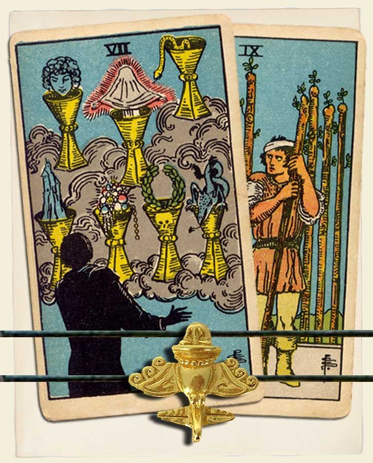 Seven of cups and Nine of wands combination means that arcane tarot forces: 1) Illusion and 2) Boundaries are affecting you in this card reading. What’s the advice of this pair? The Seven of cups represents wishful thinking or a false sense of optimism. In short, it is an illusion. This card indicates that there may be something you want but feel as if you can’t have it because someone else has more than they should. The Nine of wands indicates that your wishes will not go unanswered – at least not for long. Someone will try to stand in your way, creating conflict and limiting your freedom. Take control by setting clear boundaries with those around you.