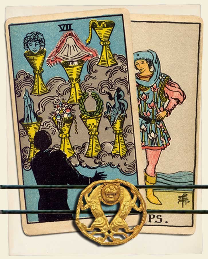 Seven of cups and Page of cups cards means that two forces: (1) Wishful Thinking (Seven of Cups) and (2) Creative Opportunities (influence of Page of cups) have influence on you today. In other words, it means if you want recognition for that big art or music project you have been perfecting, you’re going to need to put it out there. Take that audition or gallery opportunity you’ve been offered. Keeping your talent to yourself won’t do you – or anyone else – any good, at all.