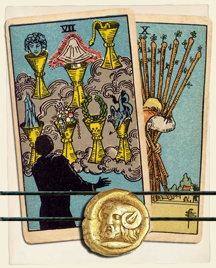 Greetings, my dear one. You come to me seeking guidance on the Seven of Cups and Ten of Wands in matters of love and relationships. These cards together bring a glimpse into your future, guided by the search for purpose and completion.