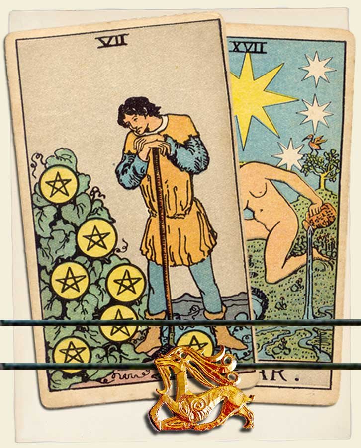 Seven of pentacles and The Star combination provides an insight into your near future. It is influenced by the arcane forces of (1) Progress and (2) Inspiration. In other words, you have come much farther in your life than you give yourself credit for. Stop being so hard on yourself and take a few moments to be grateful for where you are now in comparison to where you used to be. You are doing absolutely great, and others see you as an inspiration to their own progress. You need to see yourself as an inspiration too. Stop looking for inspiration everywhere else, you are the inspiration you need. Look at how far you have come, it is praiseworthy.