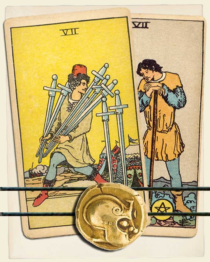 Seven of swords and Seven of pentacles combination indicates that two arcane effects: I) Betrayal (Seven of swords) and II) Harvest (Seven of pentacles) guide your life decisions today. What’s the advice of this pair? The Seven of Swords represents a high level of mental stress, often brought on by conflict or betrayal. This card is sometimes called the thief card because it indicates someone who has stolen something from you. It can be difficult to discern whether this is intentional or just carelessness, but whatever the case may be, it will cause distress for a long time to come. The presence of the Seven of pentacles indicates that there are resources available to help you rebuild what was lost. These cards indicate that you have people around you willing to lend a hand in getting things back on track.