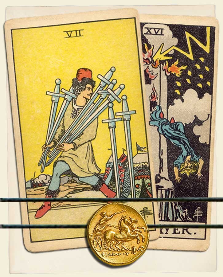 Seven of swords and The Tower combination gives you a better insight into your current state and immediate future, which is directed by the guiding influences of (A) SNEAKINESS and (B) TRAUMA (as per influence of The Tower). In essence, your guile may soon cost you. You’ve been treated badly in life, and, as a result, learnt how to protect yourself. Well, in the coming weeks, someone new will enter your life. And, as is usual when you are exposed to risk, you will try and defend yourself and wriggle free. But hold on, these cards suggest. True, you have much to lose, but, equally, much to gain.
