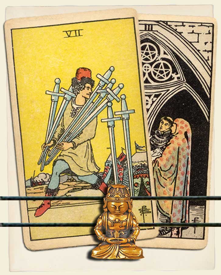Seven of swords and Three of pentacles combination is a sign that tarot influences: A) GETTING AWAY WITH SOMETHING (Seven of swords) and B) SHARED GOALS (Three of pentacles) currently guide your decisions. Your old gang is there to cover up for you, you don’t have to worry. Who finds a friend, finds a treasure: you have got a bunch of them, you can consider yourself immensely rich. Some troubles may find you along the way in the coming days: trust your pack to help you get by.