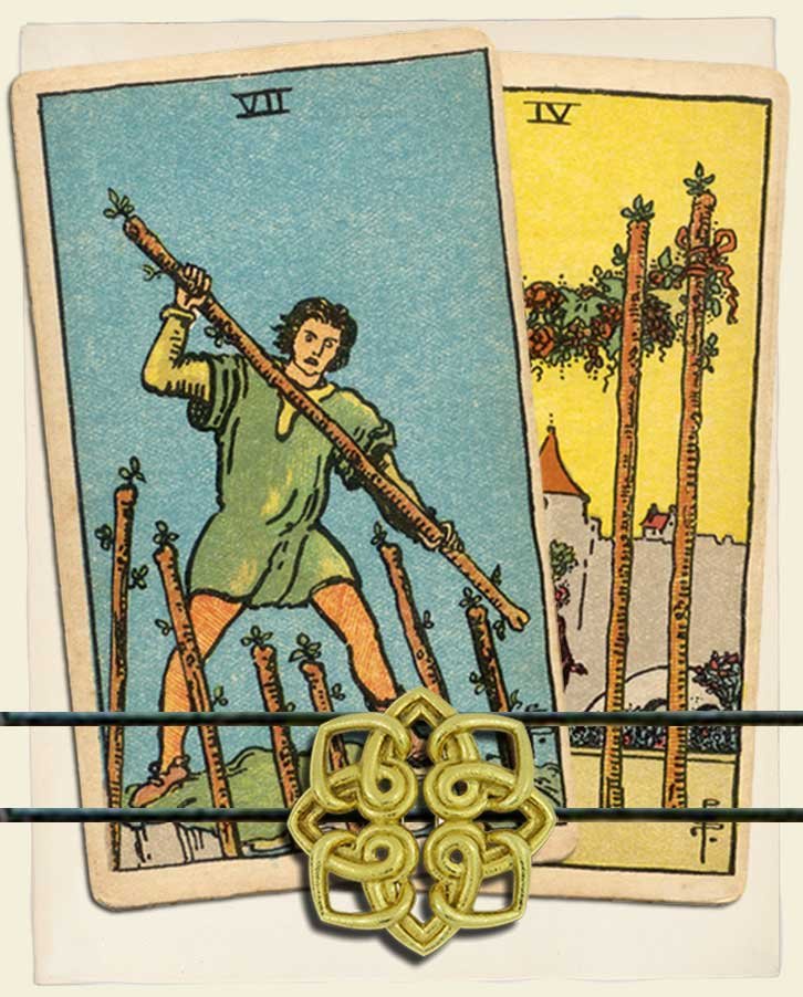 Seven of wands and Four of wands combination gives a hint about your immediate future. It is influenced by the arcane forces of (A) STAMINA and (B) CELEBRATION. You have worked hard to get here, and it shows in everything you do with the Seven of Wands present, so don’t forget to celebrate yourself for what you accomplish. There are plenty of friends or family around to help out if you need an impromptu party or maybe just some good old-fashioned food, but otherwise this should be a fun time celebrating your achievements. Don’t let yourself get too serious—you deserve this after all that work on getting here.