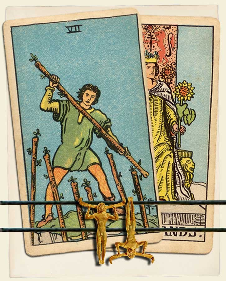Seven of wands and Queen of wands combination gives you a divination about a major event in your future, which is influenced by the tarot forces of (I) Challenge (from Seven of wands) and (II) Courage. What’s the advice of this pair? The Seven of wands represents having to defend yourself against an attack. This card indicates that there may be some kind of conflict or challenge coming your way that will require courage. The presence of the Queen of Wands indicates that whatever this is won’t be easy, but it will also have clear-cut victory conditions. If you face up to what needs to be done, take action and persevere, you should come out on top.