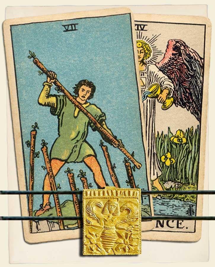 Seven of wands and Temperance combination gives you intuition about your distant and barely discernible future, which is directed by the guiding influences of (A) CHALLENGE and (B) MODERATION. In interpretation, you are actively fighting a battle you deem necessary. This could be a literal social conflict or simply a work or personal pursuit. Either way, you are being asked to persevere and keep faith in yourself. Trust the universe and your gut instincts as you maneuver through the hurdles. On another note, you may be taking on TOO many commitments for yourself right now. Be careful not to get carried away with the adrenaline of succeeding through one challenge and jumping to the next. Remember to pause and consider which battles are truly worth fighting before charging in.