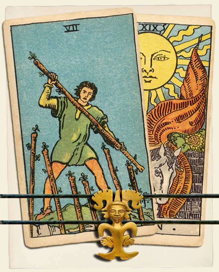 Seven of wands and The Sun tarot combination gives you a peek at your distant and barely discernible future. It is influenced by the arcane tarot forces of (A) determination and (B) success. In other words, it means your determination of bringing about your ideas and inspiration will bring about success for you and others. You are not alone, the universe is conspiring for you and will help you. It always does even when it does not feel or look like it. Remain true to all that is right and you will find success.