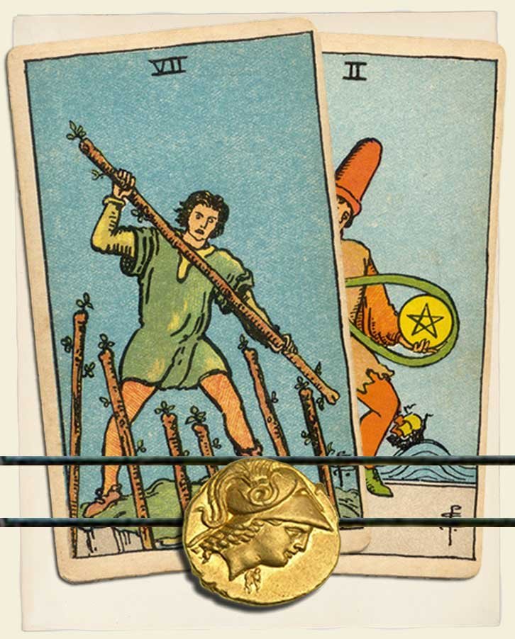 Seven of wands and Two of pentacles combination indicates that two tarot influences: 1) Challenge and 2) Adaptability are influencing you at the moment. In other words, your diligence will soon be rewarded. Lately, you’ve been facing so many setbacks, you’ve started to entertain giving up. Well, don’t, these cards suggest. Think of it this way: the vine that grows the highest does so by adapting to hardship. With each set back, you grow more certain of your goal and stronger in your self-belief.