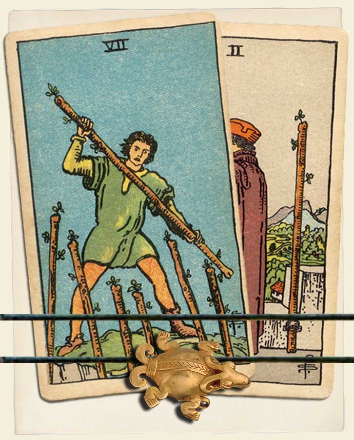 Seven of wands and Two of wands combination gives a sign that two tarot influences: (1) Protection and (2) First Steps (influence of Two of wands) are affecting your life path at this reading. In other words, it means tread carefully. With a fresh start glittering on the horizon, it will be tempting to throw caution to the wind and let your defenses down. Instead, take your time in the early stages. This combination reminds you to balance the desires of your head and heart as a means of self-protection. Remain open to positive change and the potential of new beginnings but resist the urge to rush in too quickly. Time is on your side.