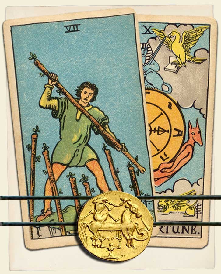 Seven of wands and Wheel of Fortune combination provides an insight into an event in your future. It is directed by the guiding influences of (A) Stamina and (B) Change (as per influence of Wheel of Fortune). Most tarot readers would consider this a sign that your hard work will soon pay off. It seems like you’ve been trying to kick water uphill of late. Everything you do fails. Well, if these cards are to be believed, that may soon change. Really, you’ve gained far more ground than you think. Soon enough, you will reach your goal.
