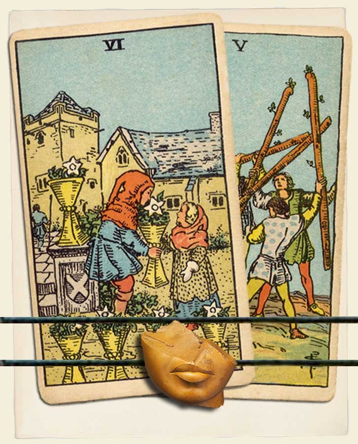 My dear child, the tarot cards have spoken of a combination that can be unsettling in love and relationships. The Six of Cups and Five of Wands together suggest both joy and conflict, indicating that there may be some competition or debate with someone familiar to you.