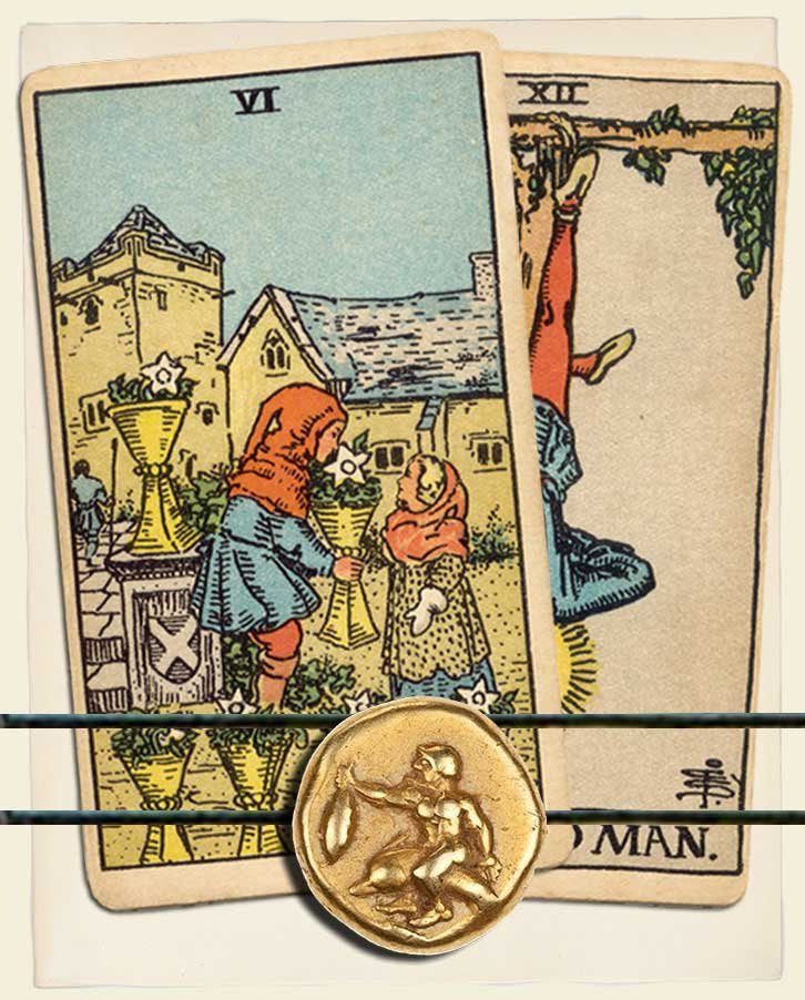 Six of cups and The Hanged Man combination means that two mystic forces: 1) SENTIMENTALITY (from the side of Six of cups) and 2) SACRIFICE (from the side of The Hanged Man) together are exerting influence on you. The time has come to sacrifice some of the possessions which have been cluttering your space. Although your sentimental nature urges you cling to these material possessions, this mindset has resulted in claustrophobia and loss of control over your surroundings. Escaping from the grip of sentimentality won’t eradicate your memories, it will help to uproot you from the past and replant you in the present. This will clear your mind and release you into the tranquility you have been longing for.