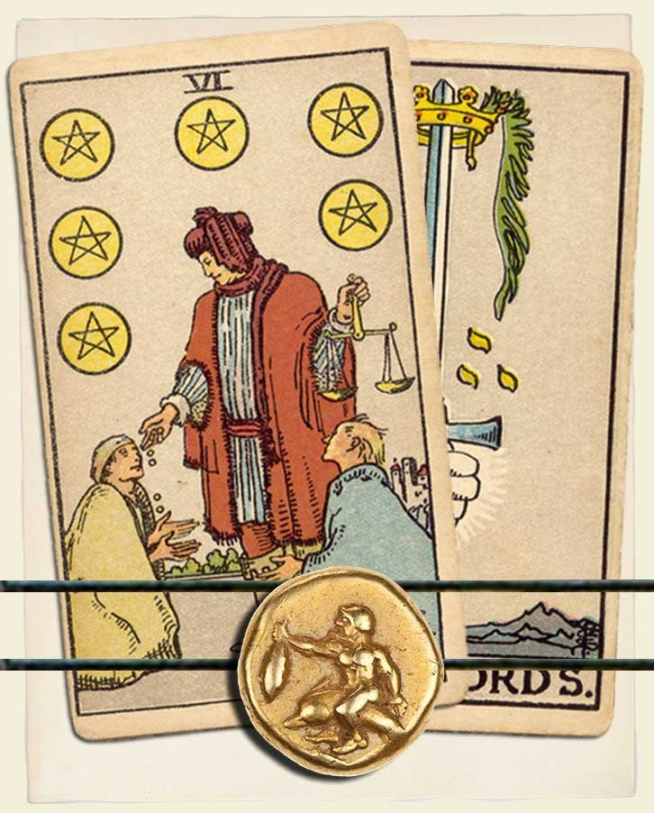 Six of pentacles and Ace of swords combination means that arcane tarot forces: 1) GIVING (influence of Six of pentacles) and 2) CONCENTRATION (influence of Ace of swords) are affecting your person at this moment. To put it differently, it gives you a sign to be generous with the time and money you have available. What’s the advice of this pair? The Six is often called the card of marriage or relationships. It represents creating strong bonds that will last over time. This energy can create obligations as well as give rise to them, so make sure you’re not taking on more than you can handle. The presence of the Ace indicates that there may be some things in your life that need to be examined closely before they can be resolved fully. If so, take advantage now while concentration is high enough for these matters to receive proper attention.