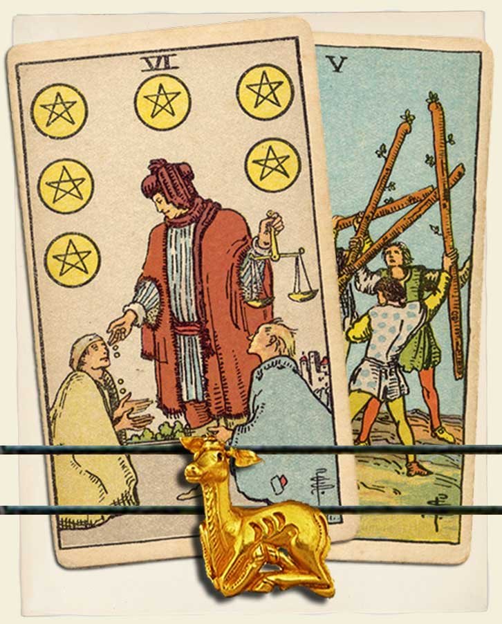 Six of pentacles and Five of wands combination is an omen that tarot influences: (1) Giving and (2) Conflict (influence of Five of wands) are affecting you at this moment. Perhaps you have an internal conflict over the energy you give to others, or an uneasiness tied to needing support. Either way, there are some conflicts in deciding where to put your energy right now (and how). It’d be best to work through these conflicts by taking action rather than keeping these issues stagnant in your mind. What needs my attention now? Do I have the resources to support a new project? No matter the specifics, you are being called to consider and act upon your priorities at this time.