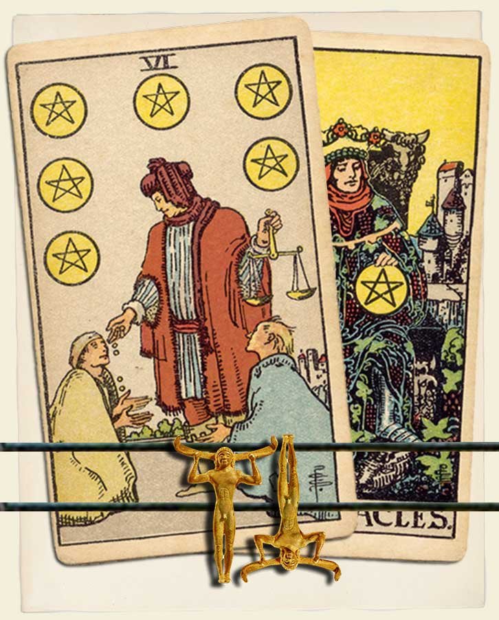 Six of pentacles and King of pentacles combination means that two forces: 1) Community (from the side of Six of pentacles) and 2) Leadership (from the side of King of pentacles) together are exerting influence on you. Most tarot readers would consider this as a hint for you to think about volunteering somewhere. Maybe this is the thing that has been missing from your life. In your community you must show others that you are there for them and that you care about them. Whatever you’re good at, run a group and encourage others to join. For example, are you good at piano? You could volunteer to teach interested students for free. In this way you are the leader, and you are doing something nice for your community.