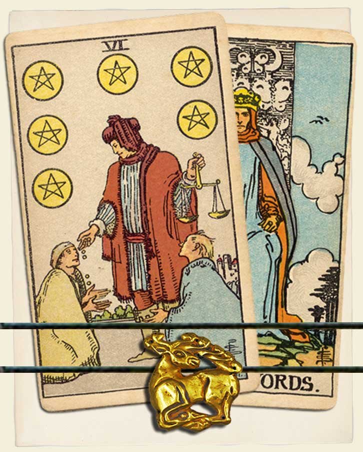 Six of pentacles and King of swords combination gives you a peek at your distant and barely discernible future, which is influenced by the arcane forces of (A) GIVING and (B) AUTHORITY. In other words, it means that sometimes the best leaders are the ones who give others a chance. The next time you are in a position of authority, allow someone else an opportunity to feel like they are the ones who are in charge. This act of giving will make you the best leader in town.