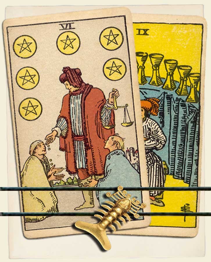 Six of pentacles and Nine of cups combination means that two arcane dynamics: (1) Receiving (Six of pentacles) and (2) Wish Come True (influence of Nine of cups) are exerting their influence on your life’s choices. What’s the advice of this pair? The Six is a card often received as a sign that you have done well in some important area in your life. It can also indicate waiting for something to happen or even stagnation. This indicates that you may be holding on too tight, though. The Nine of cups represents wish fulfillment after long hours spent hoping against hope things would turn out right for you. In combination with the Six, this indicates that whatever it is you’re waiting for will come true soon enough anyway because it has already been brought into fruition by your hard work and patience.