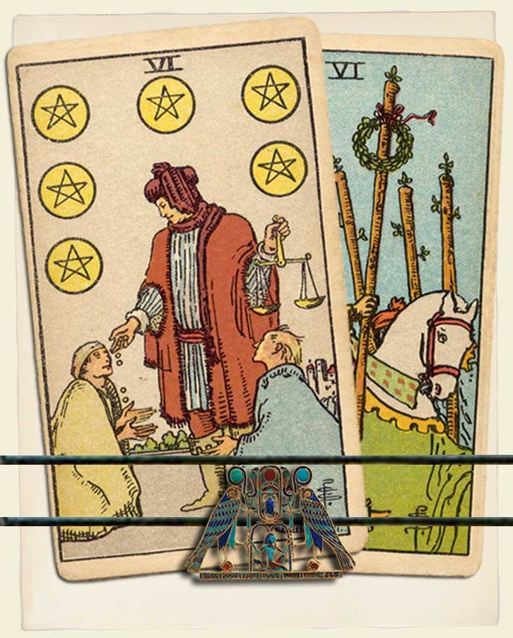 Six of pentacles and Six of wands combination is a sign that two tarot influences: A) Charity (Six of pentacles) and B) Progress (Six of wands) have influence on you at this moment. In other words, it means that those around you will share in your victories, as you will share in theirs. Whether directly or indirectly, there is a sense of collaboration and community, and positive energies will be reflected. Take this time to spread joy and abundance with others, and you’ll find that you receive plenty in return.