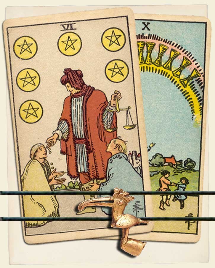 Six of pentacles and Ten of cups combination provides an insight into a major event in your future, which is directed by the guiding influences of (A) GENEROSITY and (B) HARMONY. To put it differently, it gives you a sign that through generosity & the ability to help others, you will achieve personal peace. The 6 of Pentacles is a card that represents someone who is stable in their income, but also comfortably shares that abundance with others. Paired with the 10 of Cups, which symbolizes harmony, abundance, and a sense of personal fulfillment, the cards show that you will fill your own cups, and the cups of others by sharing (within your means) the abundance with which you have been blessed.