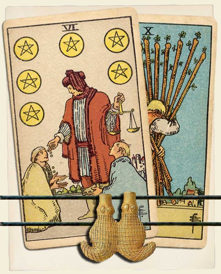 Six of pentacles and Ten of wands tarot combination means that two mystic forces: A) Receiving (Six of pentacles) and B) Obligation (Ten of wands) drive your choices at this moment. What’s the advice of this pair? The Six of pentacles represents receiving with gratitude, even abundance. You are likely feeling a sense of duty to give back in return. This can be burdensome or even stifle growth, though. The Ten of wands indicates that you have obligations you feel bound by but may not know how to fulfill. Perhaps it is family matters or perhaps it is work-related issues, as indicated by the presence of the Ten o’ Wands – hardworking people who often get little appreciation for their efforts. If so, take some time off from giving out and try taking a break yourself.
