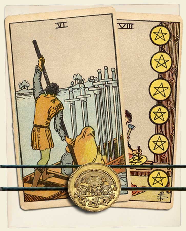 Six of swords and Eight of pentacles combination is a sign that two arcane forces: (1) Change and (2) Expertise are exerting their influence on your life’s choices. What’s the advice of this pair? The Six of swords represents moving from rough waters to calm waters. This indicates that you may be in a period of transition, where things will change significantly for the better. You’ll have more control over your circumstances than before, because you’ll know how to take advantage of the new situation you find yourself in. The Eight of pentacles represents having everything we need to build stable lives together as a community. It also represents learning all we need to know about our craft or trade so we can pass it on to others who can use it well too. If you’re feeling stuck, now is an excellent time for you to seek out help with upgrading your skills or taking classes at a local college or university.