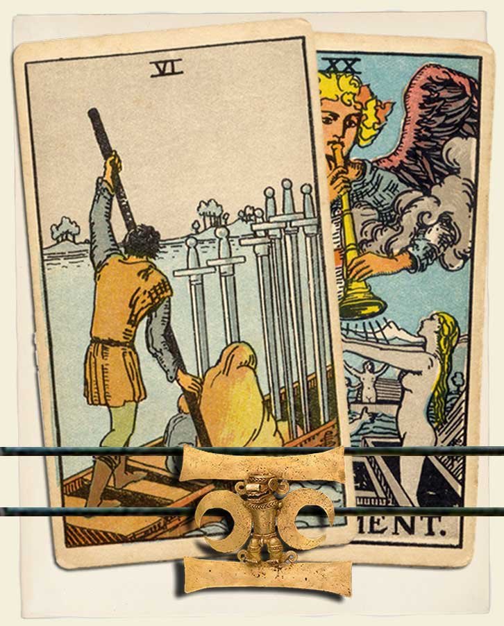 Six of swords and Judgement combination provides an insight into your actual state and close future, which will come about from the influences of (1) DISTANCE (effect of Six of swords) and (2) JUDGEMENT (effect of Judgement). To put it differently, it indicates that something in your life has recently come to an end. This could be a relationship, friendship, or job. This separation from your situation is giving you time to look at the bigger picture so you can know what you want going forward. Think of this as a time of spiritual growth and rebirth.