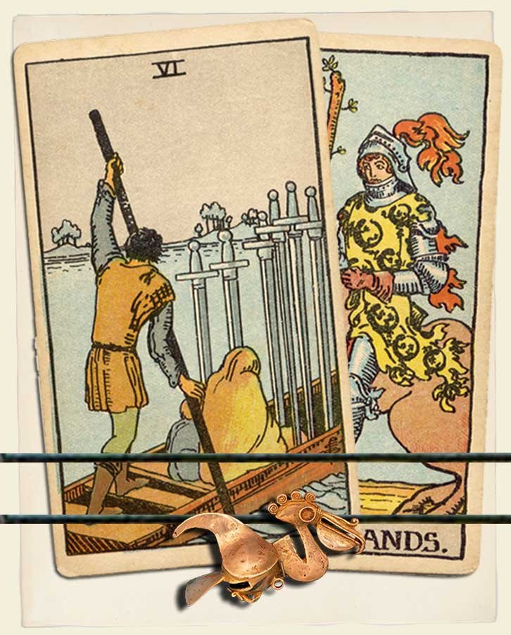Six of swords and Knight of wands tarot combination indicates that mystic tarot forces: 1) Distance (influence of Six of swords) and 2) Energy (influence of Knight of wands) are altering your life path today. No matter how badly you want to keep approaching the lovely person who has become your new neighbor, stop doing so. They are not destined to be more than a friend. There is another one you should be pursuing, and only when you stop wasting your time on the one who is not your destiny will you notice how much better a choice this other person can be.