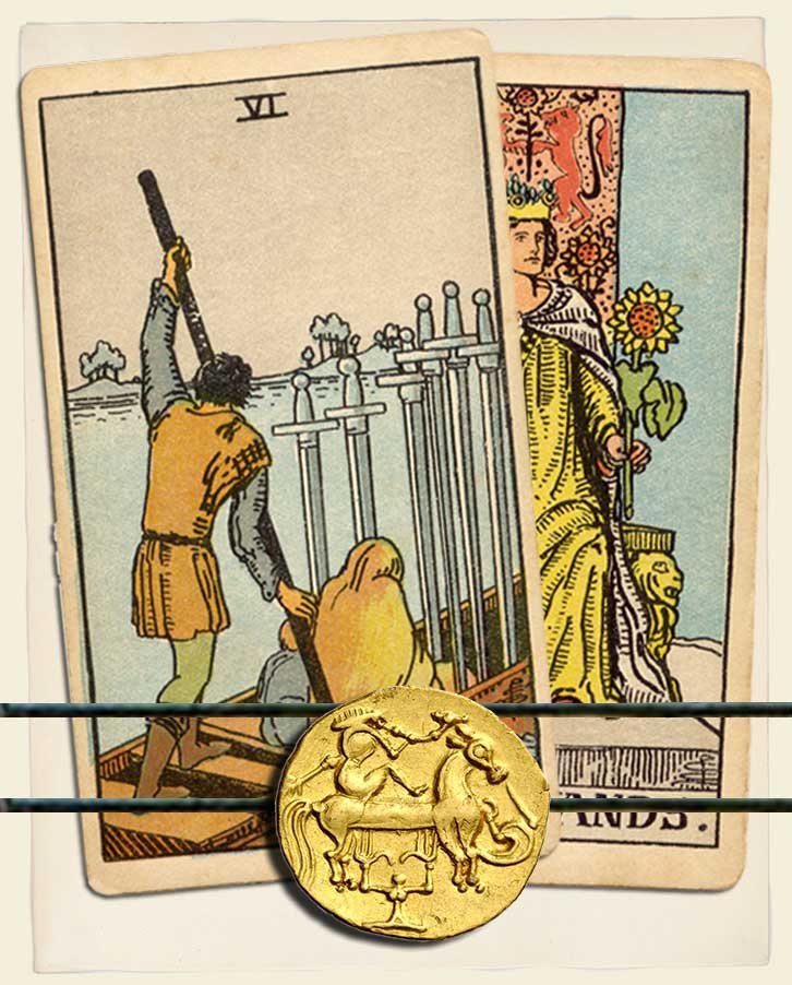 Six of swords and Queen of wands combination means that mystic tarot forces: 1) Departure and 2) Determined have influence on you today. What’s the advice of this pair? The Six of swords represents moving from rough waters to calm waters. It’s a slow transition that takes place after a long period of difficulty. The urge to turn back to a familiar life that hurts you often arises. The Queen of wands is a determined character who gets what she wants by being persistent. This card is urging you to summon up more confidence in the brave choice you’ve made to get away from a bad situation and improve your circumstances. Keep moving forward and eventually you’ll reach your intended destination.