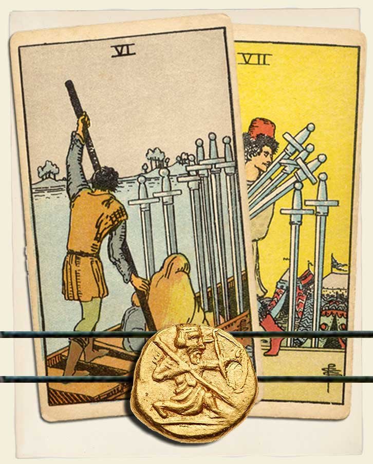 Six of swords and Seven of swords combination provides an insight into your near future. It will arise from the combined effect of: (I) TRANSITION (effect of Six of swords) and (II) TRICKERY (effect of Seven of swords). If you find yourself in a difficult or challenging situation, it may be necessary to make a difficult decision in order to move forward. This may cause some regret or sadness, but it is ultimately for the best. Be careful of backstabbing bitches who may try to take advantage of you during this time. Trust your intuition and gut instinct, and don’t let anyone talk you into anything that doesn’t feel right. And just to be petty for the sake of it, always forgive your enemies—nothing would annoy them more.