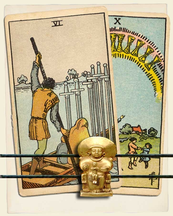 Six of swords and Ten of cups combination indicates that mystic tarot forces: (1) Change and (2) Homecomings are influencing you at the moment. How to interpret this tarot combination in practice? If this pair appears, someone can expect to be transitioning into finding their inner happiness. The person may be or will be feeling a sense of fulfillment after finally walking away from someone or something. This pair usually indicates that someone will be moving forward without looking back and will focus on making their dreams come true.
