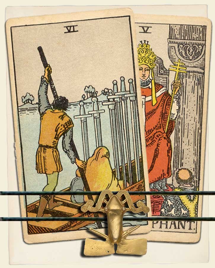 The Six of swords and The Hierophant combination means that two forces: (1) Releasing Baggage and (2) Spiritual Wisdom have an influence on you at this moment. The mother and child depicted in the Six of Swords are fleeing the turbulent waters of their past behind, heading towards the serene seas of the future. The six swords represent the remnants of the previous struggles which must be discarded so the vessel can float lightly forward. Doing this requires spiritual wisdom and fortitude. This can be found in examining and learning from inherited spiritual knowledge. Others may have faced similar challenges. Learn from them how to let go.