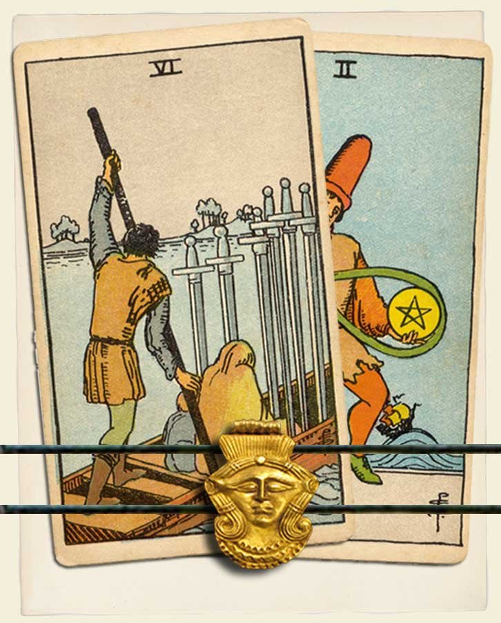 Six of swords and Two of pentacles together means that two arcane effects: 1) Rite Of Passage and 2) Balancing Resources are exerting their influence on your life’s choices. In the near future something big will be going on in your life. This is not necessarily a good kind of “big thing” therefore be prepared to spend some money. In preparation for obstacles that come in your life and you have no control over them, you should consider becoming much better at balancing your resources and at saving your money and putting some away specific for emergency funds.