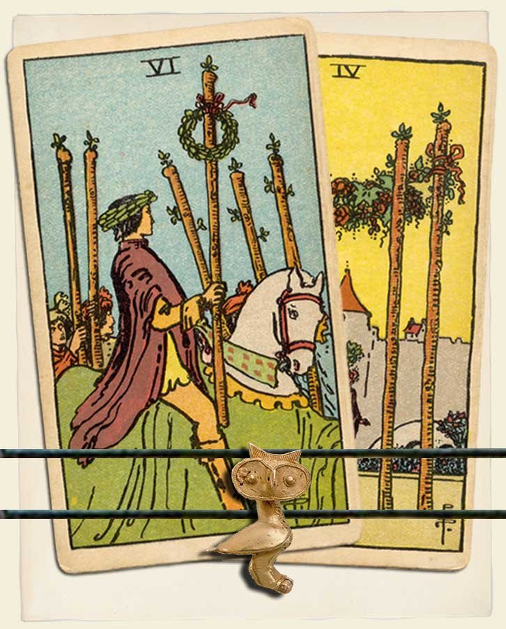 Six of wands and Four of wands combination means that two forces: 1) TRIUMPH and 2) PARTIES are steering you into another direction today. When you see the Four of Wands, a little merriment and some appreciation for your friends, family, and coworkers is in order, and they will surely be in a mood to appreciate you in return when that four is with the Six of Wands, so don‘t let yourself do that wallflower thing. This is a fun time and marks the rewards for everything you and your tribe have accomplished. You can ride the moment, and there is no need to lose yourself. All you must do is reach out.