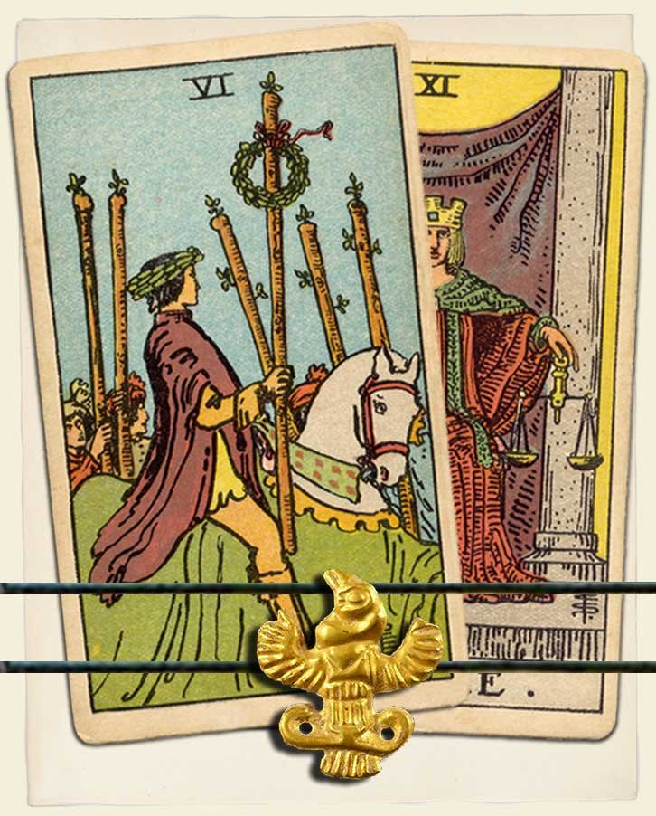 Six of wands and Justice combination means that two arcane dynamics: A) PROGRESS (Six of wands) and B) CONSEQUENCE (Justice influence) are steering you in another direction today. In other words, it means that the direction you are headed is set to weigh your world back into balance. Continue to trust your judgment and believe in your capabilities now. More specifically this can predict success through a recent legal or financial matter. Regardless of your particular situation, your next steps are infused with justice for all you have already accomplished. Keep faith and trust the efforts you make, so long as you remain true to yourself.
