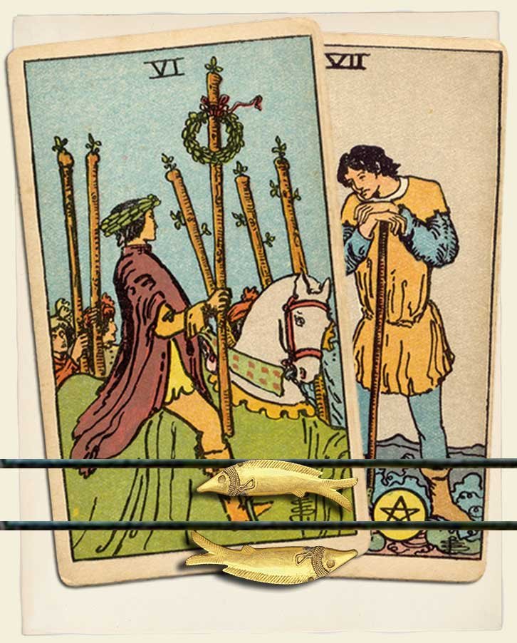 Six of wands clarified by Seven of pentacles cards indicate that tarot influences: (1) Self-Confidence (Six of Wands) and (2) Results (influence of Seven of pentacles) govern your life perception today. The message is intended to reassure you that your belief in yourself has been justified. When you stepped out in faith recently, you showed you had the ability to do what they all said you couldn’t do. Your performance has shown everyone you are a force to be reckoned with.