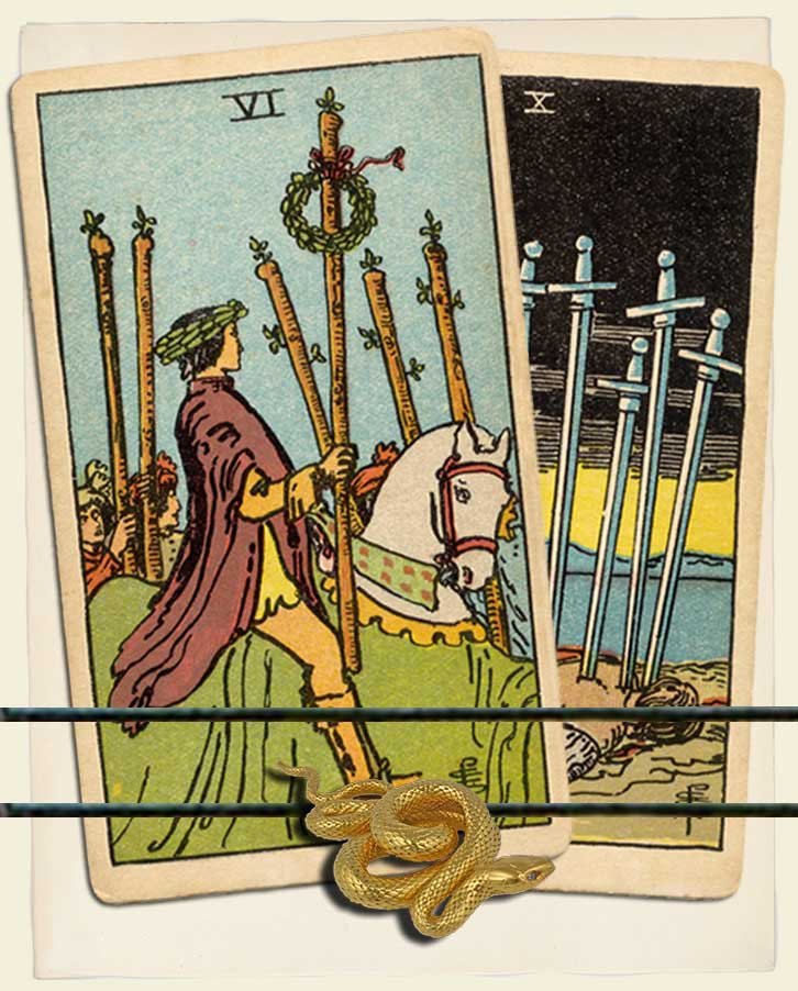 Six of wands and Ten of swords combination means that arcane tarot forces: 1) SUCCESS and 2) DEEP WOUNDS are jointly affecting you today. This reading implies that your suffering will come to be your strength. Think of it this way: the best fighters learn their craft through pain. And you’ve been learning a great deal lately. Well, keep your chin up. With each blow survived, you learn a new lesson. Soon enough, you will be a force to reckoned with.