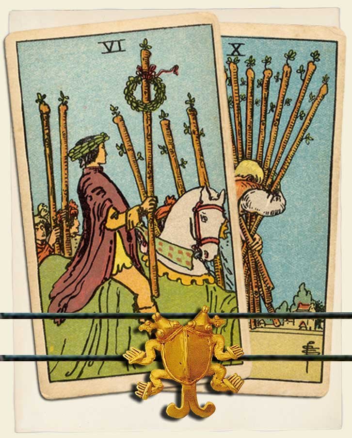 Six of wands and Ten of wands combination provides an insight into your near future. It will arise from the combined effect of: (I) REWARDS (effect of Six of wands) and (II) RESPONSIBILITY (effect of Ten of wands). You have worked hard, and it has paid off. There is something in your life that you can take credit for, but there is also a sense that things are not quite as they should be. The rewards you have received haven’t changed anything much, so why do you feel this way? Perhaps it is time to delegate some responsibilities or maybe even take on new ones where needed. Whatever the case may be, now is a good time to consider how best to use what you have learned here.