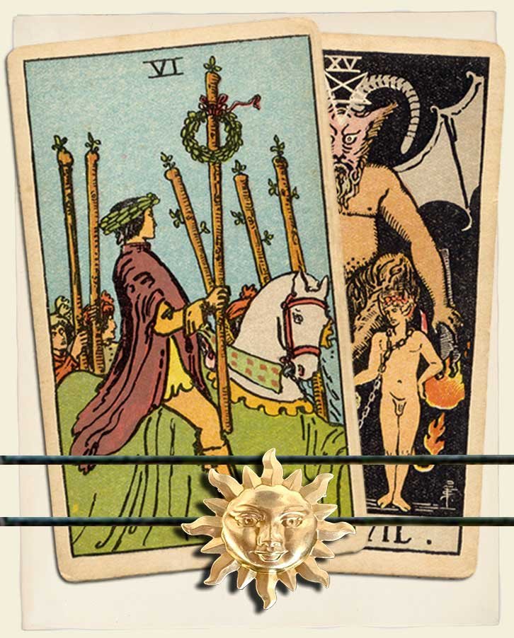 Six of wands and The Devil combination indicates that two mystic forces: 1) Progress (Six of wands) and 2) Attachment (The Devil) are at play today. In other words, it means that now is NOT the time to let yourself get too attached to modesty. When the Six of Wands comes to visit, it is time to be proud of yourself for what you have accomplished. Now, you may not understand what that accomplishment is or, with the Devil in tow, you may be afraid that others will not agree with the value of your accomplishments, but the Devil is also insisting that this is up to you. No one can take anything from your self-opinion that you don‘t give them. Celebrate you, and others will follow.