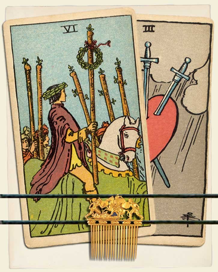 Six of wands and Three of swords combination provides an insight into your current state and immediate future, which is influenced by the arcane tarot forces of (A) RECOGNITION and (B) SEPARATION. A reading like this implies you may need to leave a once cherished relationship behind. Really, if you’re honest, you’ve known it yourself for some time. You’re just going through the motions by now. Well, if you’re to find yourself again, these cards suggest you’re going to have to take that first bold step and break free. An old friend will be there to greet when you do: yourself.