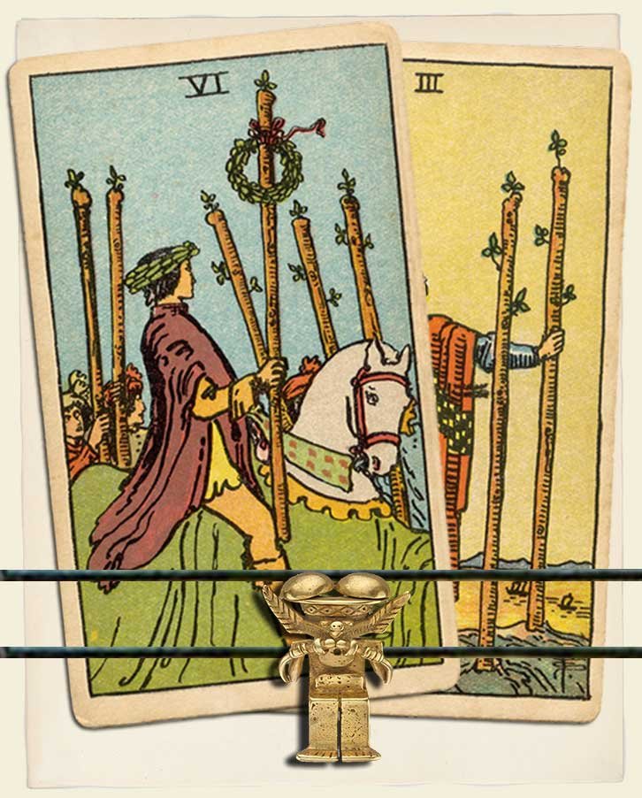 Six of wands and Three of wands combination means that two tarot influences: (1) Self-Confidence and (2) Progress (influence of Three of wands) have influence on you today. To put it differently, when you came, I was dazzled by your light. You are so confident and noble that you illuminate every environment you enter like the sun. Let me put on my sunglasses before I continue. You witness people talking behind your back. Stay motivated. People love to talk about things they can never achieve. You are in a period when you will experience a sudden rise, let people talk while you rise. You just enjoy the view from the top.