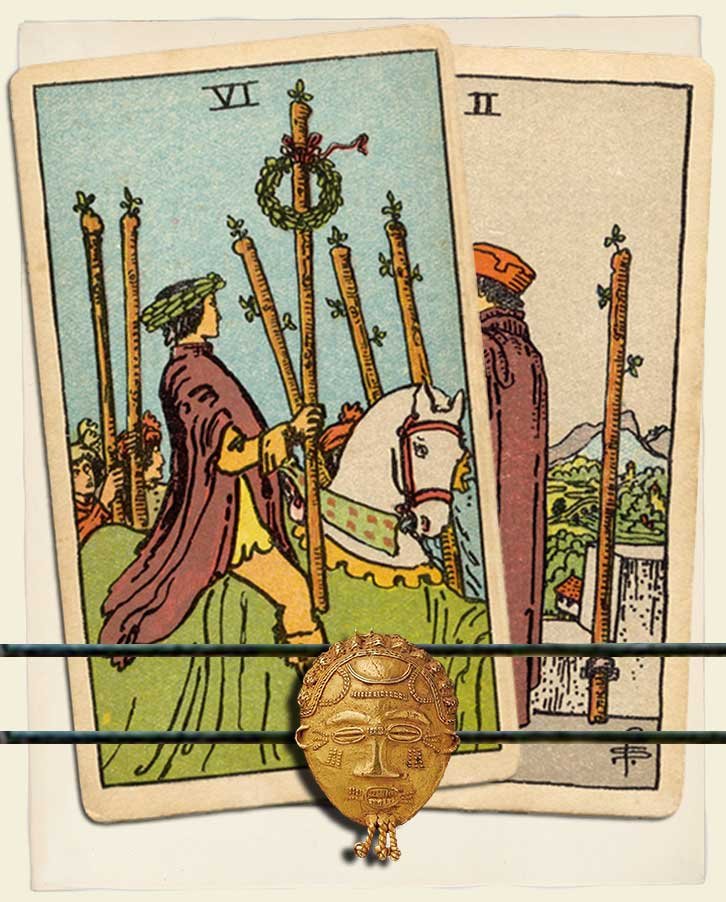 Six of wands and Two of wands combination is a sign that two tarot effects: 1) Rewards (from the side of Six of wands) and 2) Planning (from the side of Two of wands) drive your choices at this moment. To put it differently, it means you work your best traits when they are put to the test by your organization skills. If you see someone flapping, they turn to you and you ease their worries. You’ve got it covered, no problem. You are thought of highly because of this, so you should be proud of yourself.