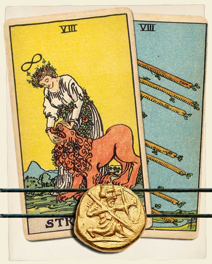 Strength and Eight of wands combination gives a sign that two arcane dynamics: (1) Compassion and (2) Fast Paced Change (influence of Eight of wands) are steering you into another direction today. In essence these cards tell me that you have doubts about some things. Stop wondering if you can go on, you have the power within you. Don’t be afraid to state your intentions. Be bold. Go and get what you want. Damn, you’re still waiting there. Hurry up and get going.