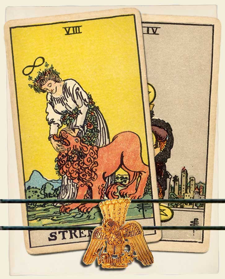 When these two cards come together, they give us a hint about our current state and immediate future arising from self-confidence (effect of Strength) and security (effect of Four of pentacles). Self-trust can either bear great fruit or lead astray depending on if it’s properly placed or misplaced respectively.