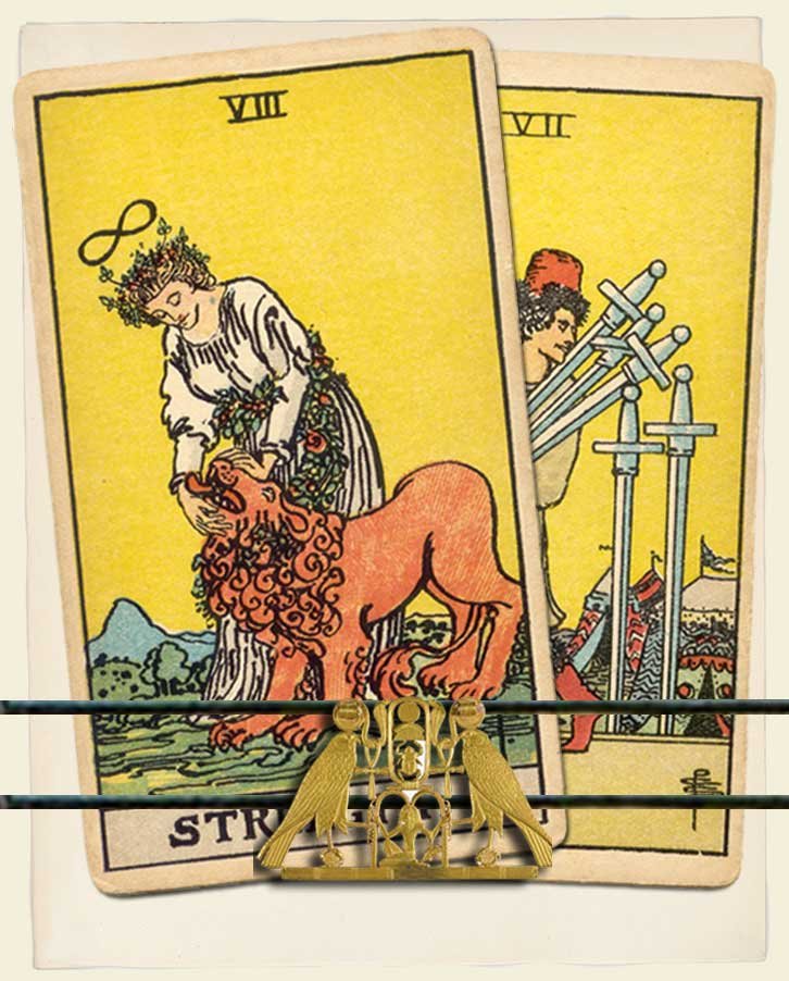 Strength and Seven of swords combo provides an insight into an event in your future, which will come to pass from the combined effect of (1) COMPASSION (effect of Strength) and (2) STRATEGY (effect of Seven of swords). This combo indicates that you may be facing shady people in your workplace, unethical behavior and strategies behind your back. Despite the negative situation, your inner strength and ability to remain calm help you bypass the badmouthing. You are always available for others and this compassion of yours will, for sure, be paying off in the near future.