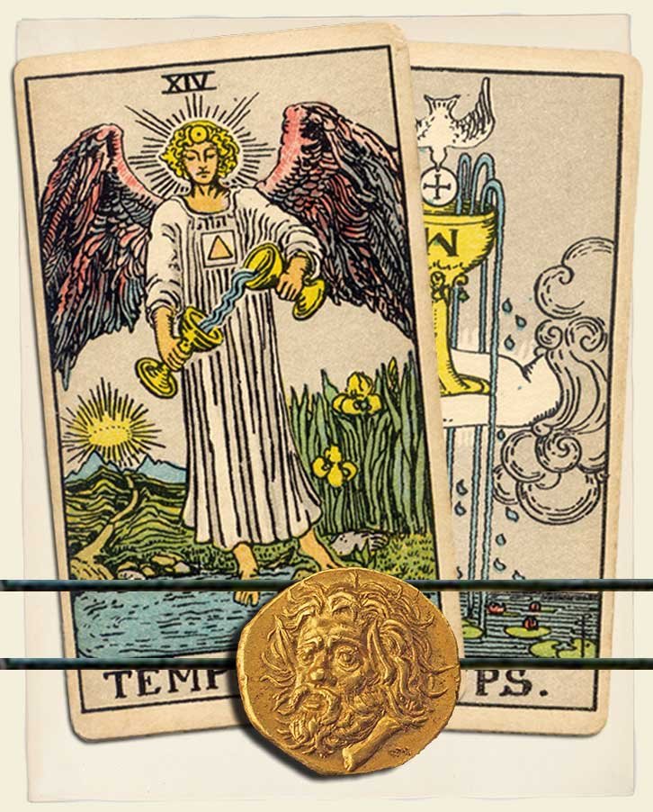 Temperance and Ace of cups combination means that two arcane effects: 1) Moderation and 2) New Feelings are exerting their influence on your life’s choices. What’s the advice of this pair? Temperance is a card of patience that allows you to wait for something new to come into your life. The Ace of cups represents emotions flowing freely, often from a new relationship. This energy can be overwhelming, so it may be prudent to take things slowly with someone you care about deeply. If you’re single, don’t rush into anything before you have time to think about how things will work out if things go wrong. Slow down and enjoy the feeling of being in love without rushing headlong into trouble.