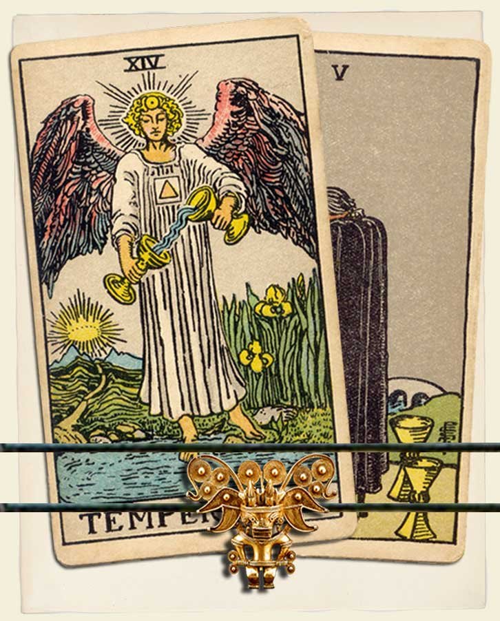 Temperance and Five of cups combination gives a hint about a significant event in your future. It will come to pass from the combined effect of (1) Balance (effect of Temperance) and (2) Sadness (effect of Five of cups). In other words, it means the effect of something that’s been lowering your mood will begin to fade. What’s the advice of this pair? You may have been feeling down or even depressed about something, as indicated by the Five of cups. This energy is sometimes described as crying over spilled milk. Disappointment is always difficult to deal with, but it’s possible that you’re dwelling on it too much. When this happens your life falls out of balance. The presence of the Temperance card indicates that things will soon put things back in equilibrium. Temperance is a healing energy that allows you to balance the dark and light sides of yourself. Stop staring at the spilled milk and start thinking about moving forward.