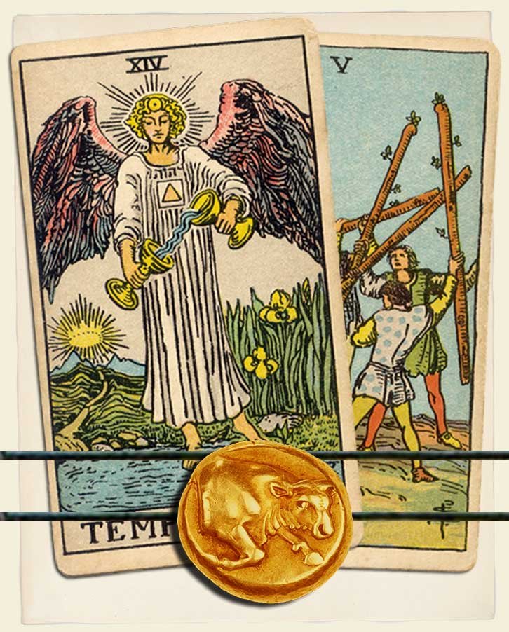 Temperance and Five of wands combination gives you a peek at your medium-term future. It is influenced by the arcane forces of (1) Balance and (2) Diversity. This pairing of the cards calls for a well-rounded and balanced approach to conflict. Temperance lets intuition and the balance of justice rule decision making, while the 5 of Wands can represent conflict, change, and even the feeling of being pulled in multiple directions. Matched together these cards bring the message to remain balanced & grounded in the face of diverse options, or conflict. Trust in your intuition & logic to make a calm and rational decision.