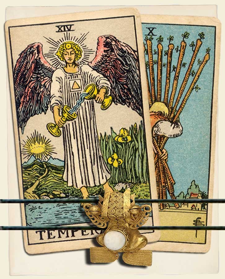Well, my dear, it seems that the Temperance and Ten of Wands combination is not exactly a desirable sign for love and relationships. While the Temperance card brings balance, hope, patience, consideration, peace of mind, stability, gratitude to the table, the Ten of Wands represents carrying an extremely heavy burden that threatens to break your back. It’s as if you are taking on more than you can manage in order to help and support those you care about – often without reciprocation.