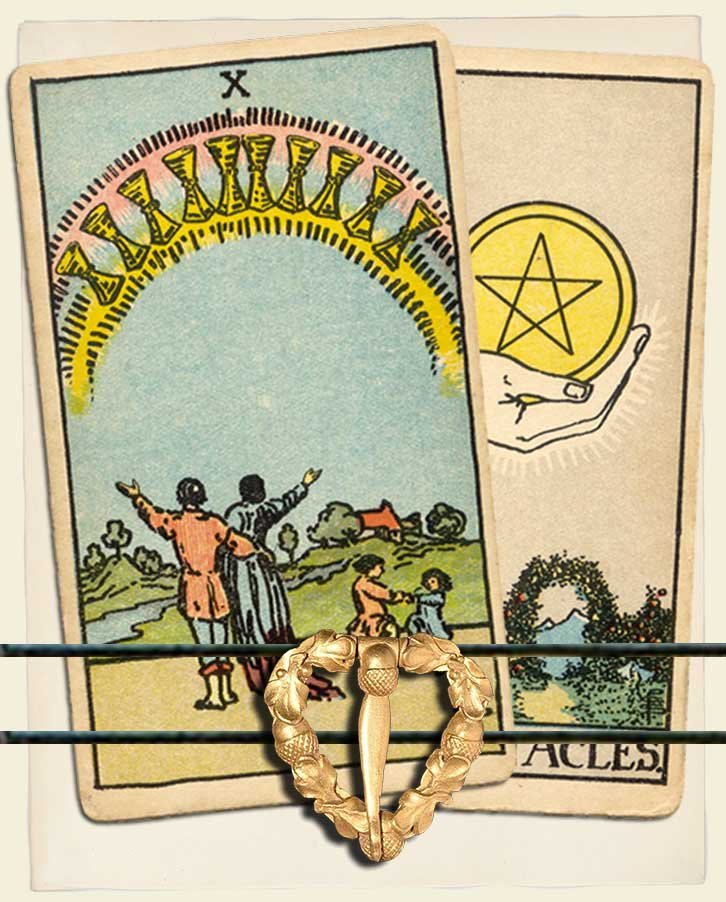 Ten of cups and Ace of pentacles combo provides an insight into an event in your future. It is influenced by the arcane forces of (1) emotional stability and (2) abundance. What does it mean? In essence, you’ve been looking in the wrong places for peace of mind. You’ve achieved much in your career and education, but now’s the time to get to know yourself. After all, these cards say, fortune changes with the whims of society and history. Wisdom, however, is timeless and inexhaustible.